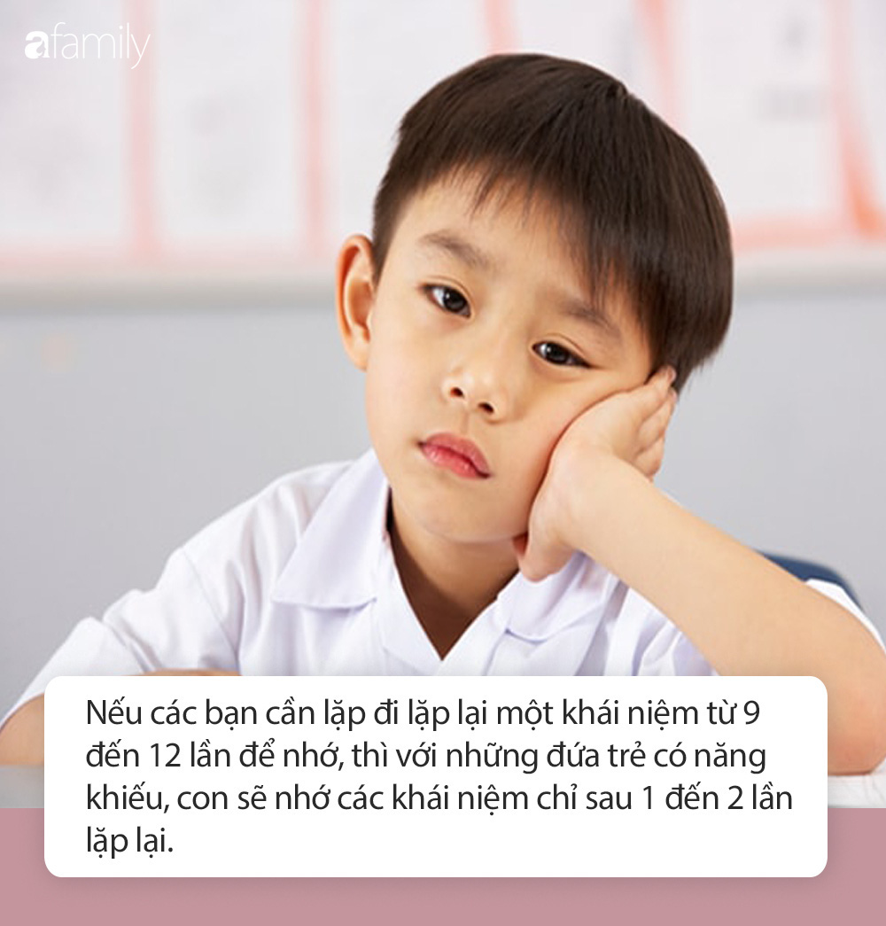 Ngay cả khi thông tin trong bài học là những điều mới mẻ đối với con, thì với một bộ óc siêu việt, con sẽ tiếp thu và học nhanh hơn so các bạn đồng trang lứa. Nếu các bạn cần lặp đi lặp lại một khái niệm từ 9 đến 12 lần để nhớ, thì với những đứa trẻ có năng khiếu, con sẽ nhớ các khái niệm chỉ sau 1 đến 2 lần lặp lại.